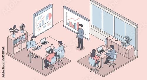 Видеоконференция, встреча, переговоры, дискуссия с арабскими бизнесменами в офисе, плоская векторная изометрическая иллюстрация. Командная работа, партнерство.
