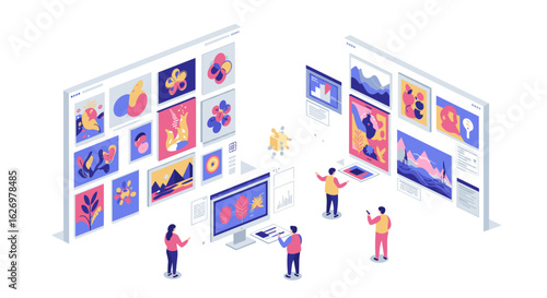 Видеоконференция, онлайн-общение, виртуальная встреча, плоская векторная изометрическая иллюстрация. Технология видеозвонковой связи, приложение для группового чата, вебинар, дистанционное образование, дистанционное обучение заочно.