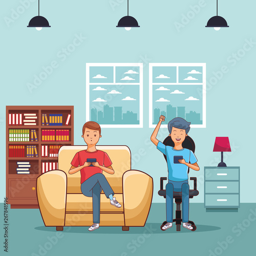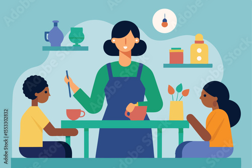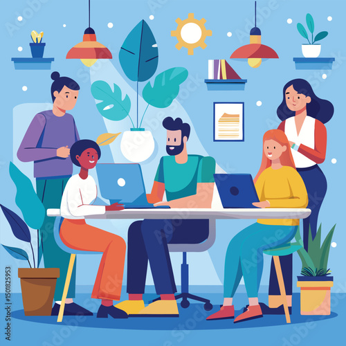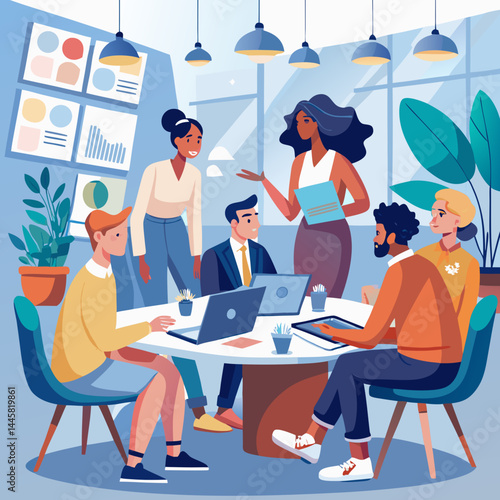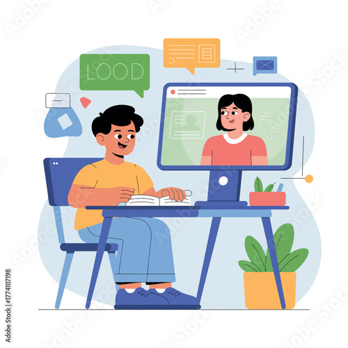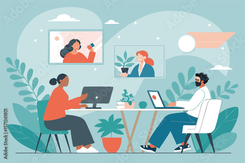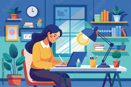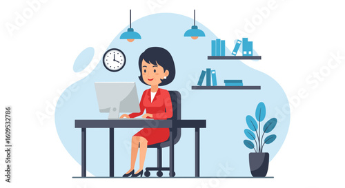 Деловая женщина, проводящая онлайн-видеоконференцию, семинар, совещание из домашнего офиса, сидя за столом перед ноутбуком, векторная плоская иллюстрация. Удаленная работа, пребывание дома в карантине, самоизоляция.