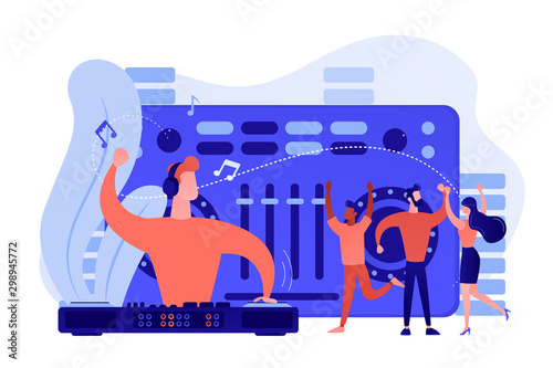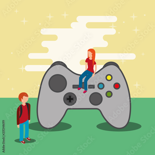 Огромный игровой контроллер для игровой консоли, микро-мужские и женские персонажи, векторная иллюстрация. Концепция технологий видеоигр для веб-баннера, страницы веб-сайта и т.д.