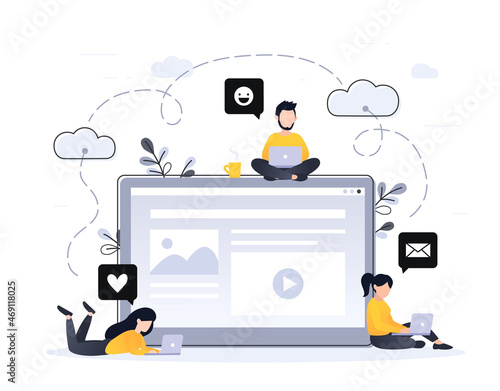 Видеоурок, векторная иллюстрация дизайна в плоском стиле. Большой планшет с учителем на экране, крошечные символы. Онлайн-образование, электронное обучение, концепция онлайн-обучения для веб-баннера, страницы веб-сайта и т.д.