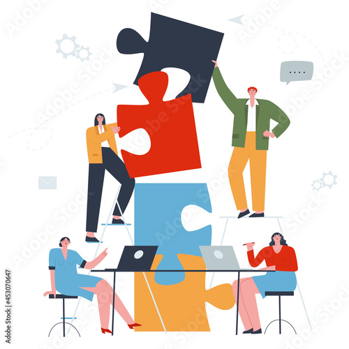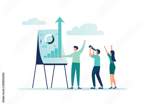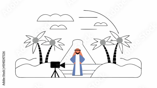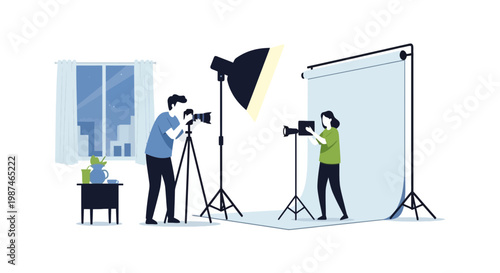 Огромная профессиональная видеокамера и съемочная группа с микро-персонажами, снимающая фильм, векторная плоская иллюстрация. Видеооператор, режиссер, девушка с хлопушкой снимает фильм. Киноиндустрия, производство фильмов.