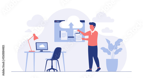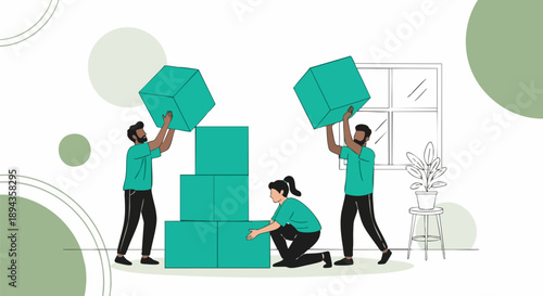 Огромная профессиональная видеокамера и съемочная группа с микро-персонажами, снимающая фильм, векторная плоская иллюстрация. Видеооператор, режиссер, девушка с хлопушкой снимает фильм. Киноиндустрия, производство фильмов.