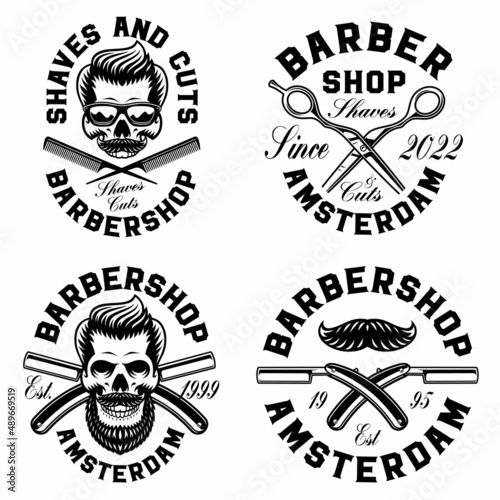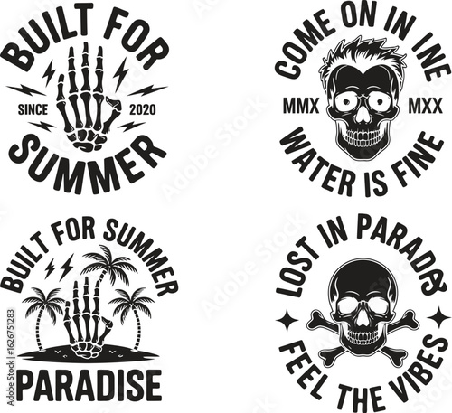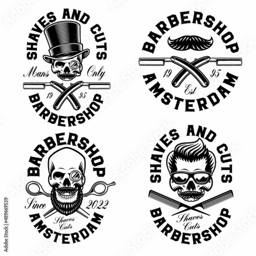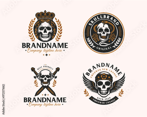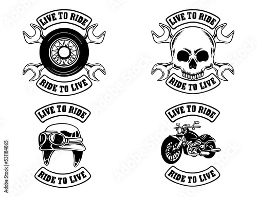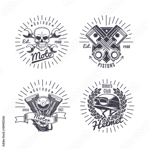 Винтажные черные этикетки moto skull, логотипы, эмблемы, значки векторная иллюстрация, изолированная на белом фоне. Дизайн типографии мотоклуба, ремонта мотоциклов и сервисного обслуживания мотоциклов.