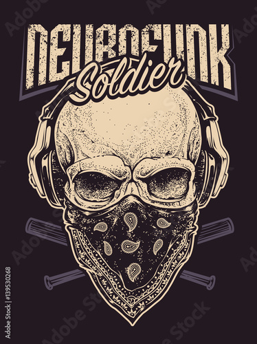 Винтажная мотоциклетная футболка векторная иллюстрация в стиле гранж. Рожденный ездить, Езжай, чтобы жить, Легендарная типография гоночного клуба мотоциклов. Монохромный череп байкера в шлеме, защитных очках и бандане.