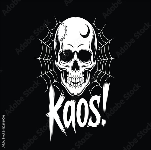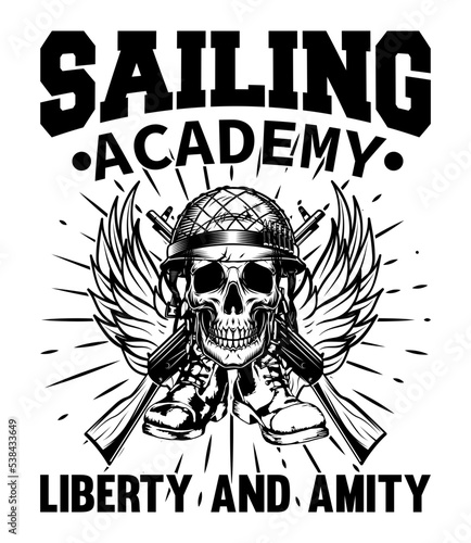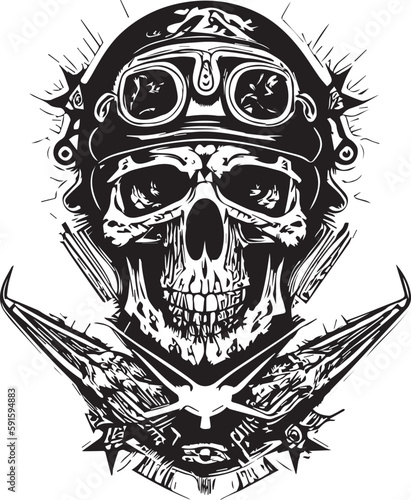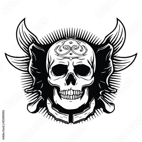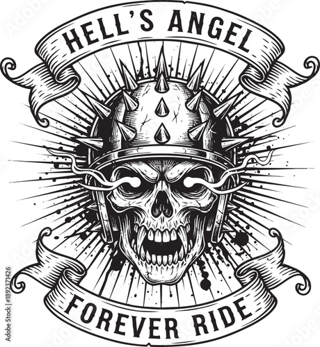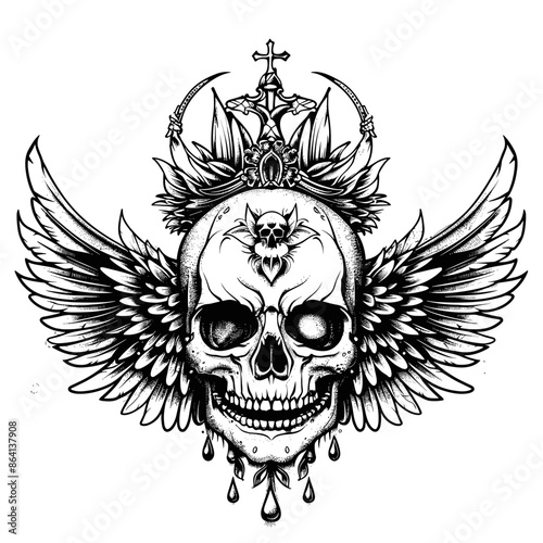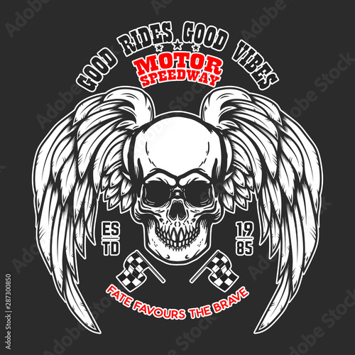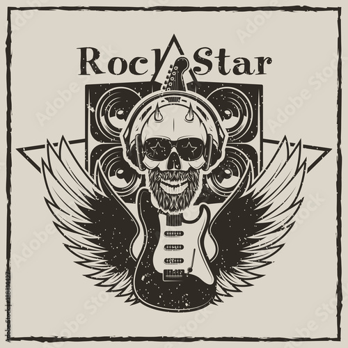 Винтажный дизайн футболки в стиле гранж рок-звезды. Векторная рисованная иллюстрация гитары, динамиков, расправленных крыльев и лысого черепа с дьявольскими рогами, слушающего музыку.