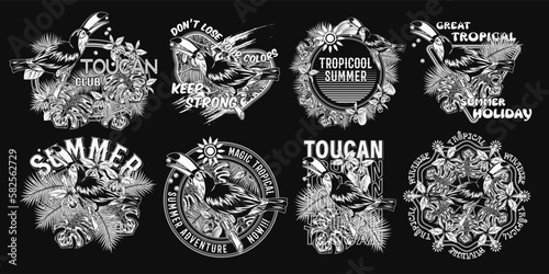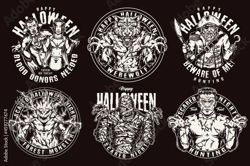 Винтажная театральная этикетка, эмблема, значок и набор логотипов, векторная рисованная иллюстрация. Символы белого театрального шоу, выделенные на черном фоне.