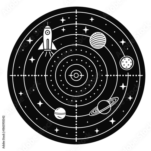 Виниловая пластинка в форме вектора солнечной системы. Креативная иллюстрация проигрывателя космической музыки. Дизайн рекламных плакатов для концертов, дискотек или фестивалей