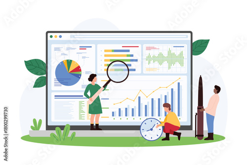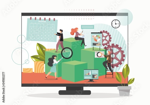 Векторная плоская иллюстрация бизнес-концепции виртуального помощника. Огромный компьютерный монитор с микросимволами бизнес-ассистентов, занятых офисной работой на экране.