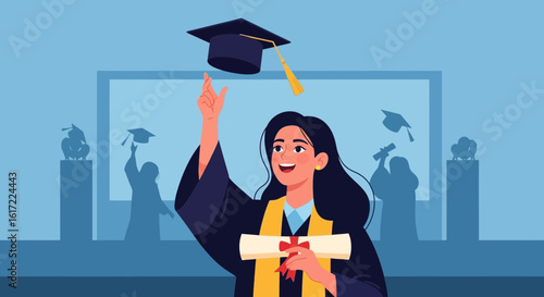 Векторная иллюстрация концепции виртуальной онлайн-церемонии вручения дипломов. Студенты заканчивают обучение по видеосвязи во время карантина по коронавирусу. Выпускники в платьях и шляпах на экране компьютера.