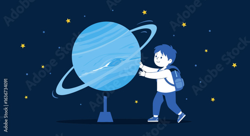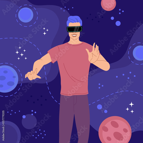 Векторная иллюстрация технологии виртуальной реальности и концепции развлечений. Мальчик в виртуальной гарнитуре летит в космическом пространстве с планетами и звездами. Космическая виртуальная игра.