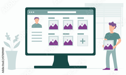 Игры виртуальной реальности, векторная плоская иллюстрация. Большой компьютер с космонавтом на дисплее, крошечные люди играют в VR-игры с помощью ноутбука и vr-очков. Концепция игры виртуальной реальности на ПК.