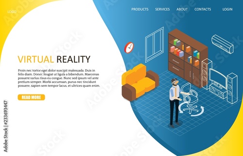 Шаблон веб-сайта целевой страницы виртуальной реальности. Векторная изометрическая иллюстрация человека в виртуальной гарнитуре, которая имитирует его физическое присутствие в виртуальной гостиной с мебелью.