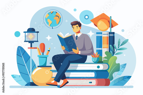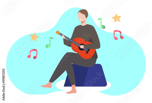 Векторная иллюстрация бородатого мужчины в очках виртуальной реальности, играющего на саксофоне дома, как настоящий музыкант, выступающий на сцене. Дизайн в плоском стиле.