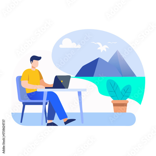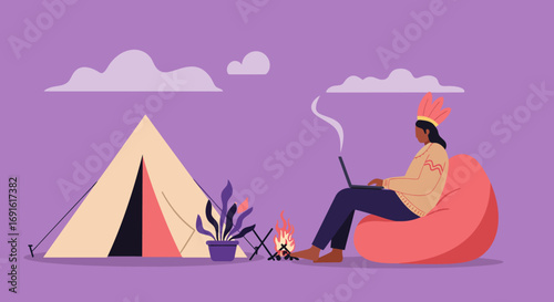 Векторная иллюстрация рафтинга в виртуальной реальности. Мальчик в виртуальной гарнитуре наслаждается греблей на надувной лодке, сидя в кресле дома. Дизайн в плоском стиле.