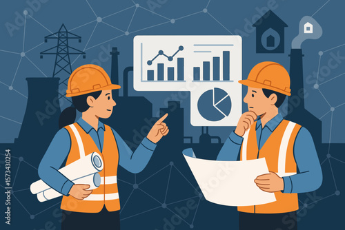 Векторная иллюстрация концепции технологии виртуальной реальности. Деловые люди мужчина и женщина в очках виртуальной реальности стоят рядом с классной доской и указывают на графики финансирования бизнеса на ней.