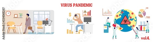 Вирусная пандемия, векторная плоская изолированная иллюстрация. Медицинское обслуживание, лабораторные исследования, правила карантина и профилактические меры, самоизоляция и работа из дома. Профилактика коронавирусного заболевания COVID-19