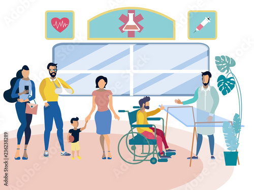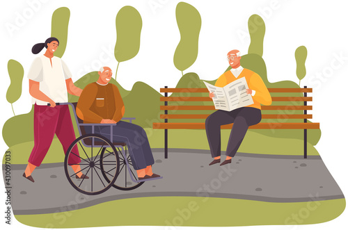 Мужские и женские персонажи-волонтеры, помогающие инвалиду передвигаться в инвалидной коляске, дарят подарки, покупают еду, векторная иллюстрация. Концепция волонтерства, альтруистической деятельности для веб-баннера, страницы веб-сайта