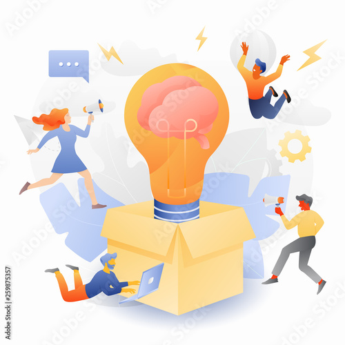 Микро-персонажи мужского и женского пола добровольно собирают еду, игрушки, одежду в огромную картонную коробку, чтобы помочь бедным людям. Благотворительность и пожертвования, волонтерство, концепция поддерживающего жилья.