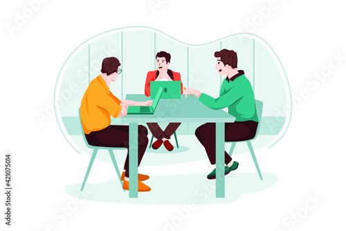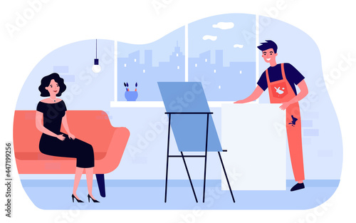 Волонтеры-парикмахеры стригут волосы бездомному, плоская векторная иллюстрация. Забота о бездомных, волонтерство и благотворительность.