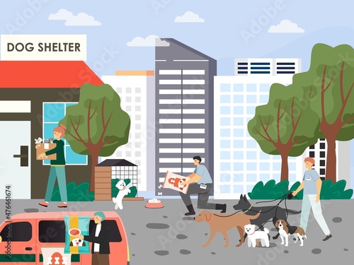 Волонтеры, ухаживающие за бездомными собаками и кошками в приюте для домашних животных, плоская векторная иллюстрация. Люди кормят, выгуливают животных. Волонтерство, уход за домашними животными.