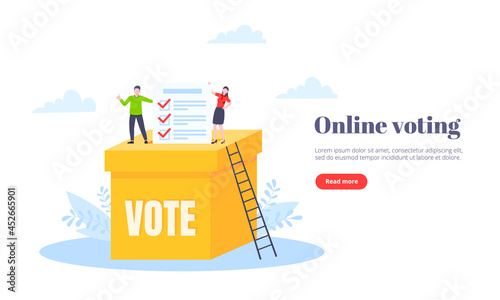 Голосование, женщина, говорящая через мегафон. Векторная плоская иллюстрация для веб-баннера, страницы веб-сайта и т.д. Избирательная кампания, концепция дня голосования.