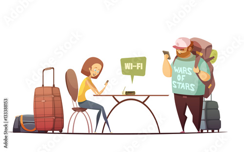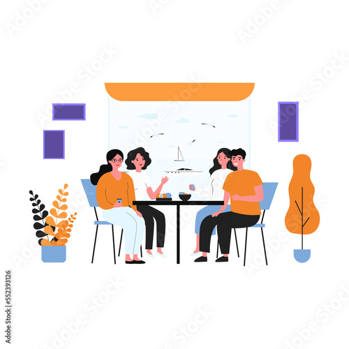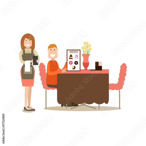 Векторная иллюстрация официантки, принимающей заказ от посетителя мужского пола, сидящего за столом и держащего меню. Элемент дизайна в плоском стиле Coffee house people, значок, выделенный на белом фоне.