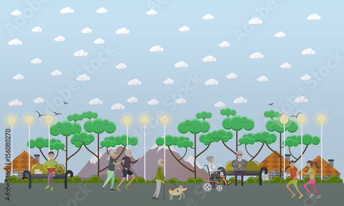 Векторная иллюстрация пожилых людей, гуляющих в парке. Активные пожилые мужчина и женщина бегают трусцой. Пожилые мужчины выгуливают собаку и сидят на скамейке, женщина едет в инвалидном кресле. Дизайн в плоском стиле.