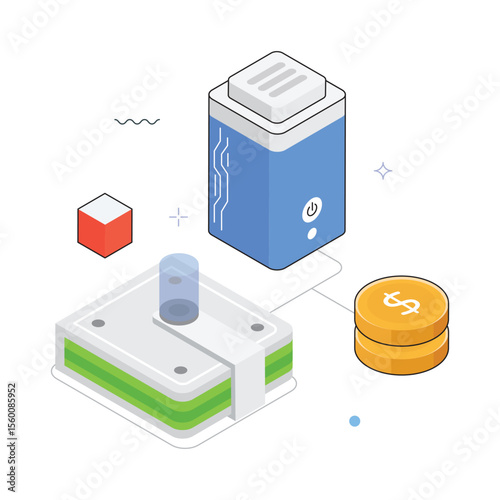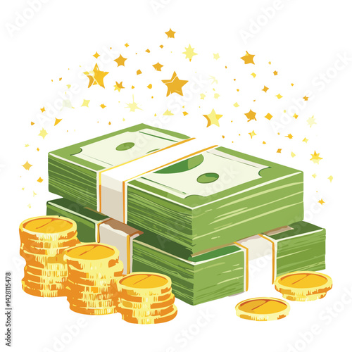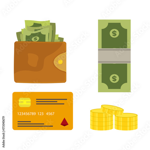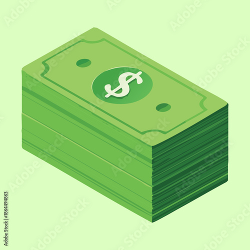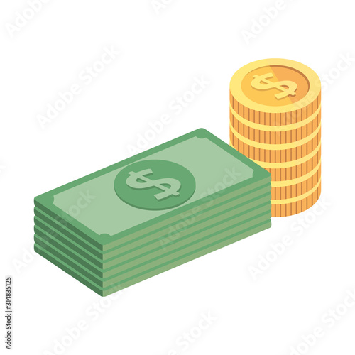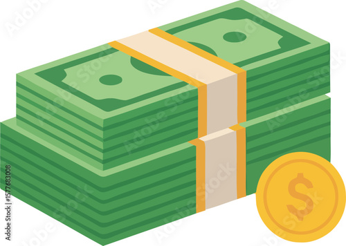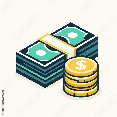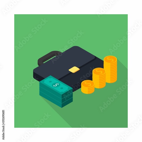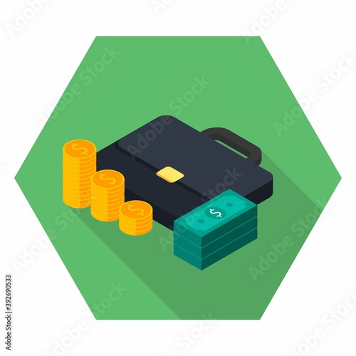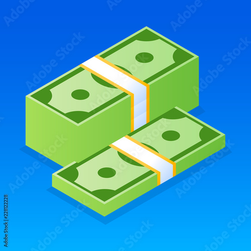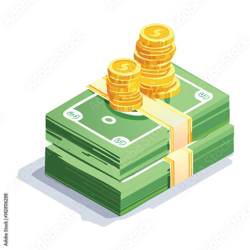 Кошелек и деньги в векторе. Изометрические наличные, стопка монет в долларах и иллюстрация кошелька на белом фоне. Банковский депозит, зарплата, финансы или комиссионные