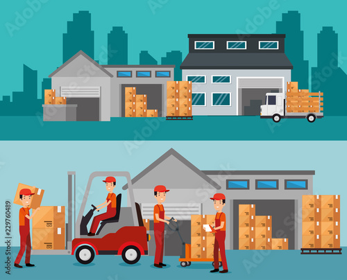Ежедневная деятельность команды склада, плоская векторная иллюстрация. Грузчики, заведующий складом, кладовщик заняты работой. Прием, отгрузка и хранение товаров.