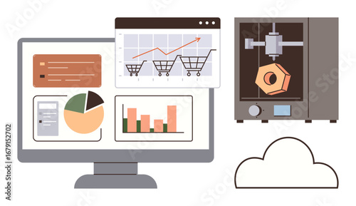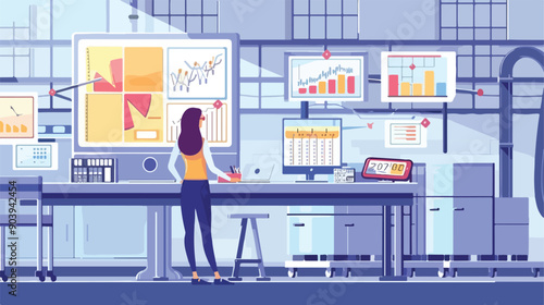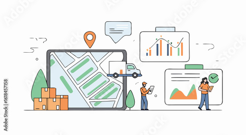 Векторная иллюстрация концепции программного обеспечения для управления складом. Башенный кран ставит картонные коробки на большие полки для ноутбуков, крошечные люди-рабочие.
