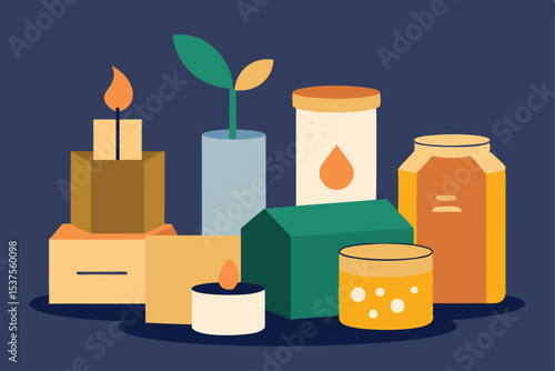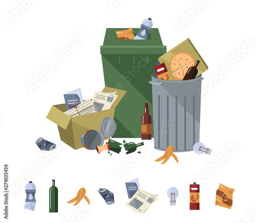 Векторная плоская иллюстрация сортировки картона для отходов. Желтый контейнер для мусора с символом утилизации и бумажным мусором, картонные коробки, бумажный пакет. Концепция экологии и переработки отходов для веб-баннера и т.д.