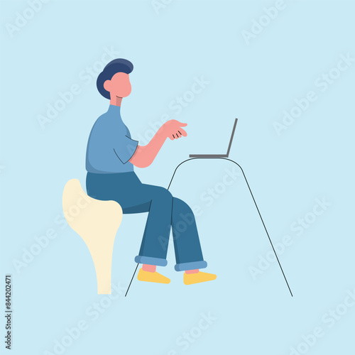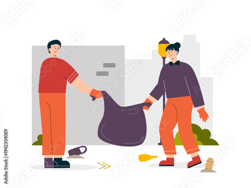Человек-доброволец кладет стеклянную бутылку в мешок для мусора, векторная плоская иллюстрация, изолированная на белом фоне. Сбор и сортировка отходов для вторичной переработки, уборка улиц, волонтерство.