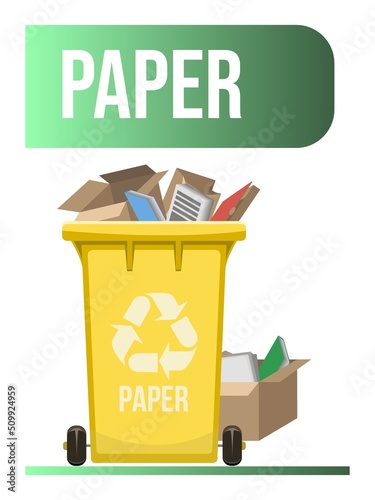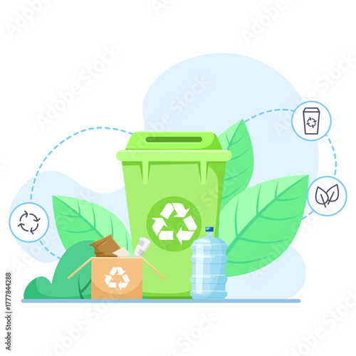 Векторная иллюстрация дизайна в плоском стиле для сортировки пластиковых отходов. Оранжевый мусорный контейнер с символом утилизации, пустые пластиковые бутылки, контейнеры. Концепция экологии и переработки отходов для веб-баннера, страницы веб-сайта.