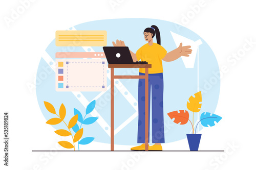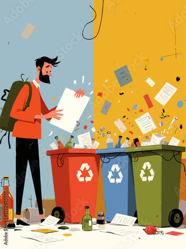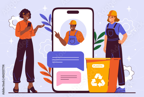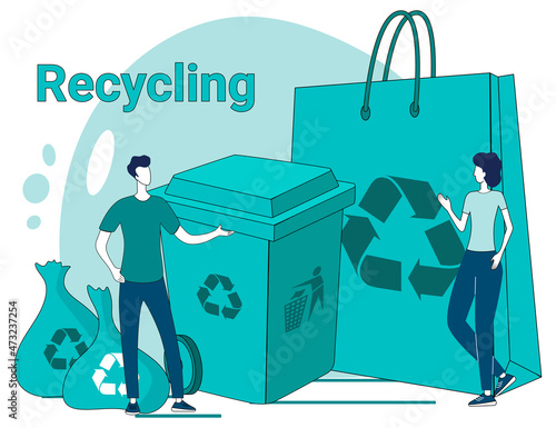 Векторная иллюстрация крошечных людей, собирающих, сортирующих и выбрасывающих мусор в большие мусорные баки разного цвета для вторичной переработки. Концепция разделения и переработки отходов для веб-баннера, страницы веб-сайта и т.д.