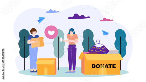 Мусоровоз, собирающий твердые бытовые отходы, люди складывают бытовые отходы в специальные контейнеры для мусора, векторная иллюстрация. Концепция сортировки отходов для вторичной переработки для веб-баннера, страницы веб-сайта.