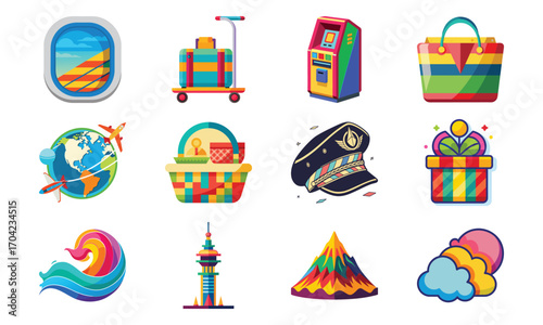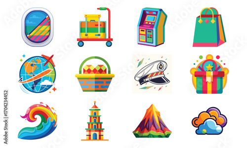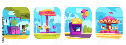 Набор слайдов в аквапарке, плоская векторная изолированная иллюстрация. Билетная касса аквапарка и аттракционы. Коллекция спиральных труб аквапарка, тюбиков, водных горок. Летние водные развлечения на открытом воздухе, развлечение.