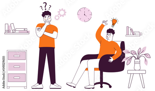 Векторная иллюстрация крошечных людей, поднимающихся по лестнице, чтобы вкрутить большую лампочку. Путь к успеху, карьерный рост, поиск идей концепций для веб-баннера, страницы сайта и т.д.
