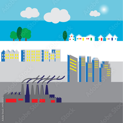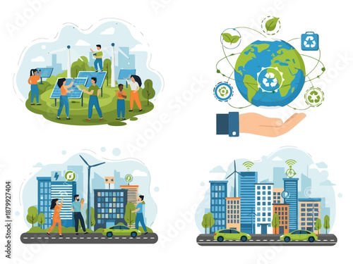 Пути развития современного экологически чистого города векторная концептуальная иллюстрация в стиле бумажного искусства. Городской пейзаж, городские элементы зданий, строительный кран, общественный транспорт, аттракционы, ветряные мельницы.