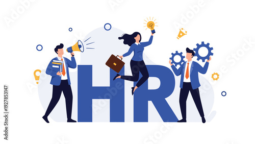 Мы нанимаем векторный шаблон веб-сайта, дизайн веб-страницы и целевой страницы для разработки веб-сайтов и мобильных сайтов. Бизнесмен смотрит на девушку на своей ладони с помощью лупы. Подбор персонала, концепция агентства по трудоустройству