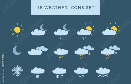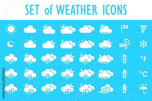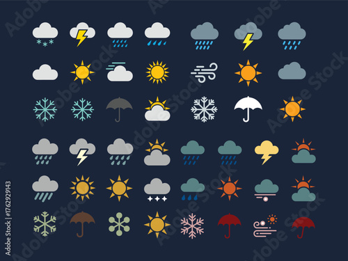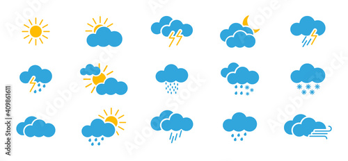 Набор иконок прогноза погоды, векторная иллюстрация в современном стиле бумажного искусства. Солнечно, частично солнечно, облачно, преимущественно облачно, дождь, снег, гроза, молния и т.д.