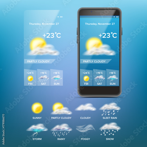 Набор значков прогноза погоды, векторная реалистичная иллюстрация. Мобильный телефон с шаблоном приложения виджета ежедневного прогноза погоды. Солнце, облака, ветер, гроза, торнадо, дождь, снег и т.д.