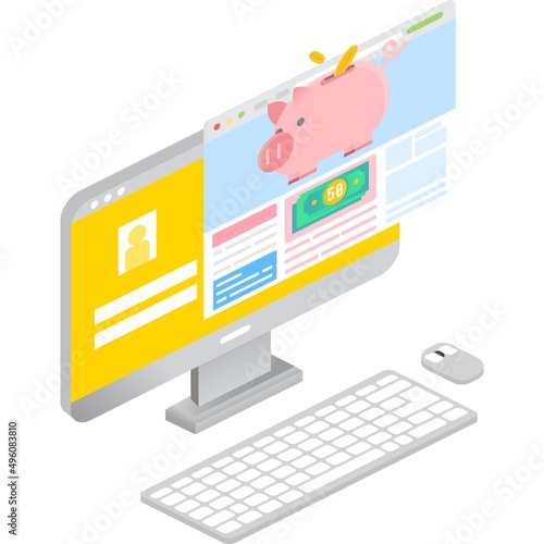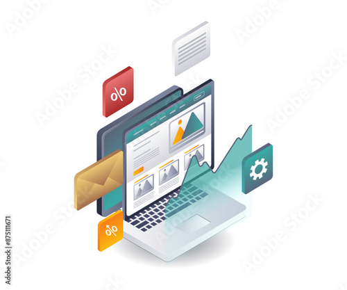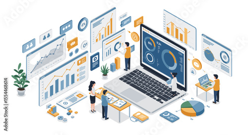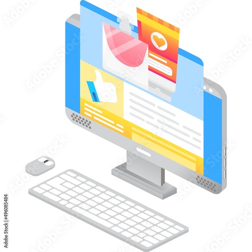 Плоская векторная иллюстрация концепции веб-аналитики. Изометрический настольный компьютер с панелью анализа данных. Анализ данных, статистика веб-сайта.
