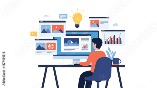 Векторная концепция разработки веб-сайта с огромным компьютерным монитором и микро-мужскими и женскими персонажами веб-дизайнеров. Командная работа, услуги веб-дизайнера, составление веб-баннера, страницы сайта и т.д.