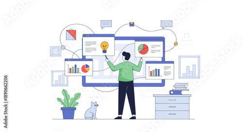 Студент смотрит лекцию онлайн с учителем на экране ноутбука, векторная иллюстрация дизайна в плоском стиле. Вебинар, веб-семинар или практикум, дистанционное обучение, образование, онлайн-видеокурс.