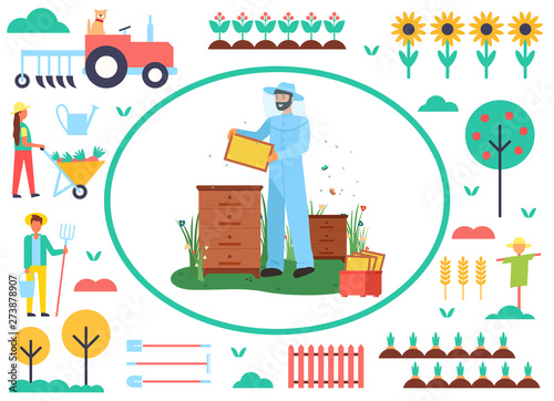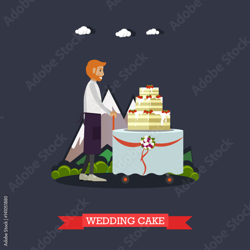 Векторная иллюстрация мужчины-официанта и большого торта с тремя ярусами. Организация свадебной вечеринки на открытом воздухе. Элемент дизайна концепции свадебного торта в плоском стиле.