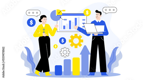 Огромный свадебный торт с женихом и невестой, кольцами и крошечными персонажами гостей, векторная иллюстрация дизайна в плоском стиле. Концепция услуг по планированию свадебной вечеринки для веб-баннера, страницы веб-сайта и т.д.