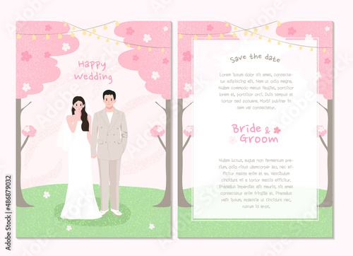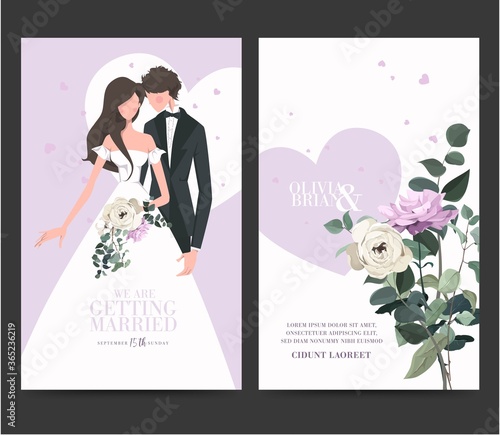 Шаблон дизайна целевой страницы с заголовком "День свадьбы" для свадебного онлайн-сервиса. Счастливые молодожены в элегантных традиционных платьях и костюмах, стоящие под аркой бракосочетания. Организация церемонии для пар