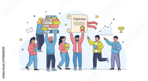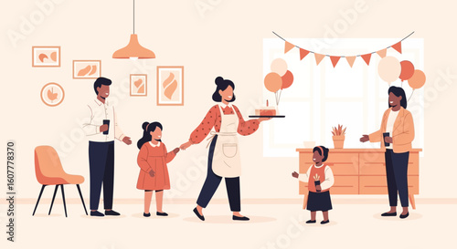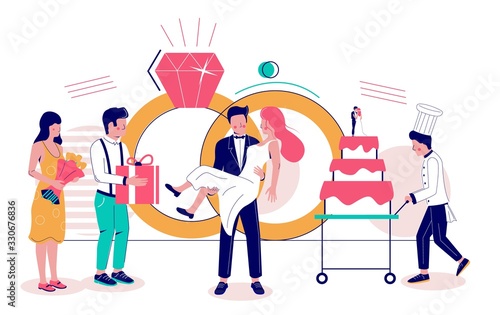 Огромные обручальные кольца и микро-персонажи жених и невеста, гости с подарками, шеф-повар с большим тортом, векторная плоская иллюстрация. Услуги свадебного организатора, концепция празднования вечеринки для страницы веб-сайта и т.д.