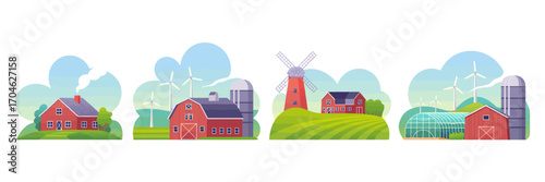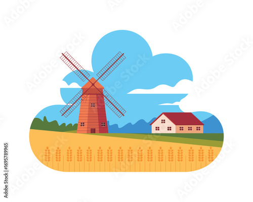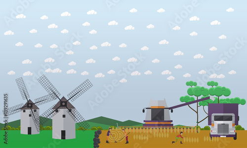 Векторная иллюстрация людей и сельскохозяйственной техники, работающих на поле. Две мельницы, зерноуборочный комбайн, грузовик, круглые тюки сена. Элемент дизайна концепции уборки пшеницы в плоском стиле